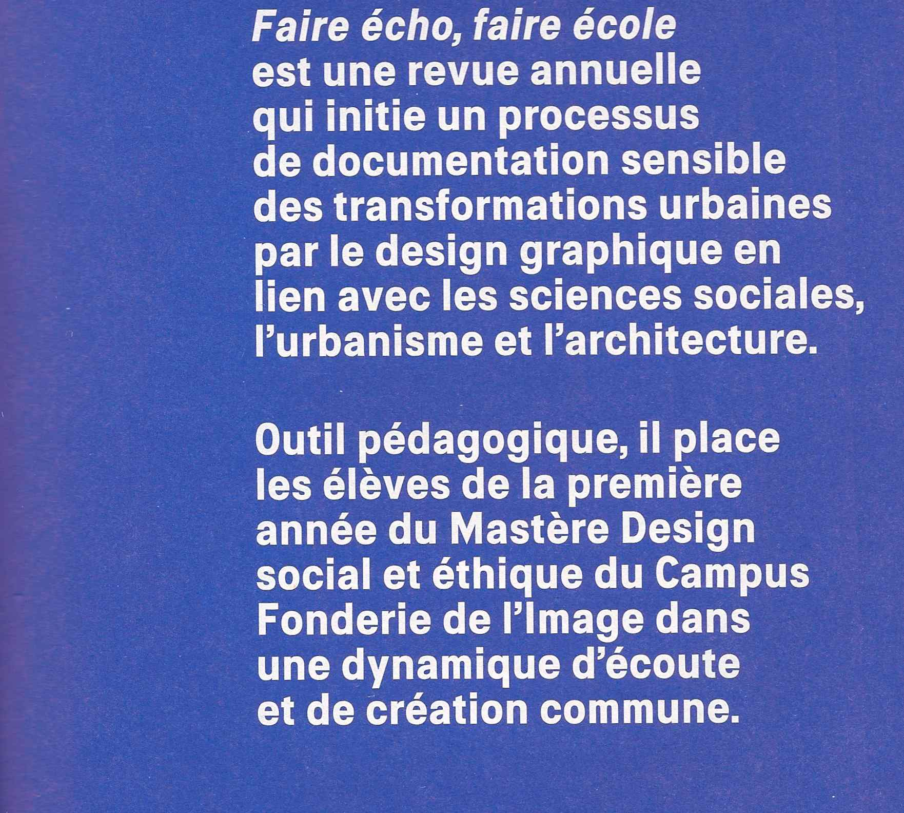Le 2e numéro de la revue Faire écho, faire école, réalisée avec les élèves du Mastère Design social et éthique du Campus Fonderie de l’Image, est consacré à la mobilité dans le contexte spécifique de Bagnolet. Notre maire-adjointe Edith Félix a été interviewée. Voir ci-dessous ainsi que le sommaire de cette revue passionnante et passionnée.