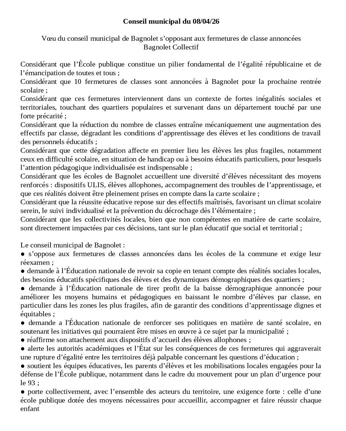 Le Conseil municipal du mercredi 8 avril a adopté à l’unanimité un vœu s’opposant aux fermetures de classes annoncées dans notre ville et soutenant le plan d’urgence pour l’éducation dans le 93. Auparavant, une délégation conduite par le Maire, Edouard Denouel, et comprenant l’Adjoint à l’Education, Frédéric Gabin, et d’autres élu.es, Edith Félix, Chawqui Haddad, Jean-Claude Oliva, a participé au rassemblement devant la préfecture mardi 7 avril.